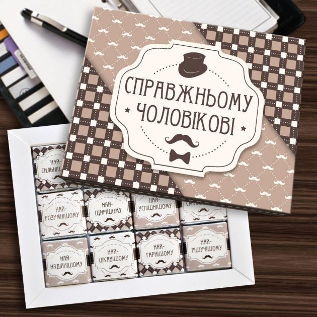 Чоловіки теж люблять смачний шоколад, тому подарунковий шоколадний набір – це завжди безпрограшна ідея! Шоколадки в наборі оформлені приємними словами на адресу коханого чоловіка. Такий шоколадний набір потішить кожного та підніме настрій на довгий час. Потрібно тішити своїх чоловіків частіше!