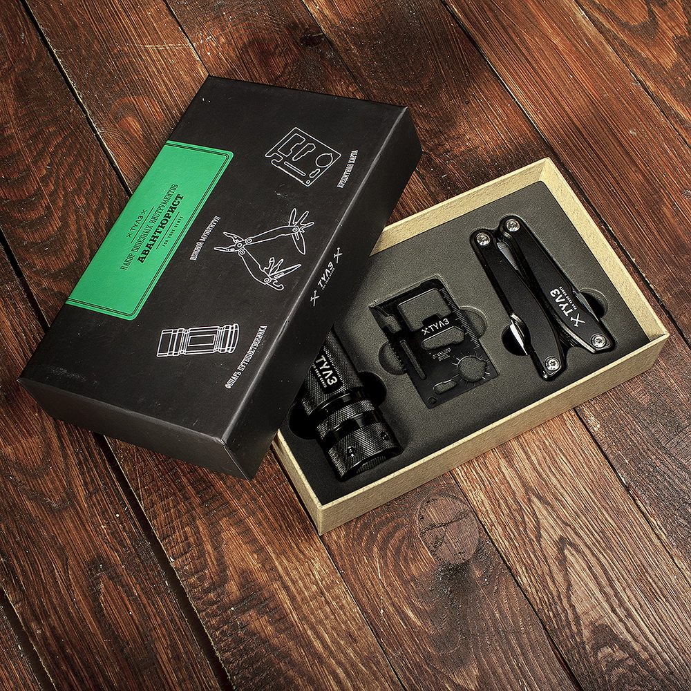 Набір інструментів – це завжди гарна ідея подарунка чоловікові. Набір «Авантюрист» має все необхідне на всі випадки життя. Такий набір неодноразово врятує його власника в складних ситуаціях. Також, набір стане чудовим варіантом подарунка для любителя риболовлі, полювання та подорожей!