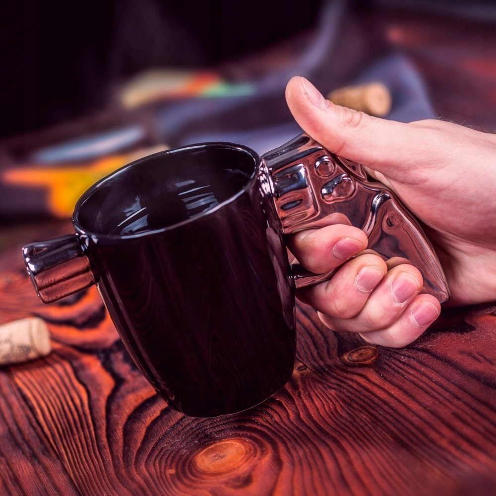 Кружка-пістолет у подарунок підкреслить мужність та рішучість свого власника. Ручка у формі рукоятки револьвера виглядає креативно та додає стійкості чашці. Таке вушко гарантує надійний хват і не дасть обпектися. З оригінальним кухлем улюблений напій смакує ще краще!