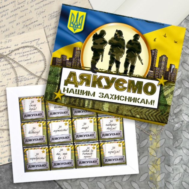 “Дякую” з солодким присмаком – це шоколадний набір «Нашим Захисникам». Коробка з тематичним зображенням містить цукерки з молочного та чорного шоколаду. Кожен смаколик має індивідуальне “дякуємо” за особливі якості наших героїв: мужність, хоробрість, відвагу тощо.
