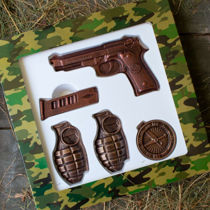 Шоколадний набір “Пістолет і гранати” – “вибуховий” подарунок для любителів ласощів. Фігурки з шоколаду відрізняються реалістичністю та філігранною роботою. Вироби точно передають колір та всі деталі предметів. Набір упаковано в тематичну коробку з прозорим вікном.