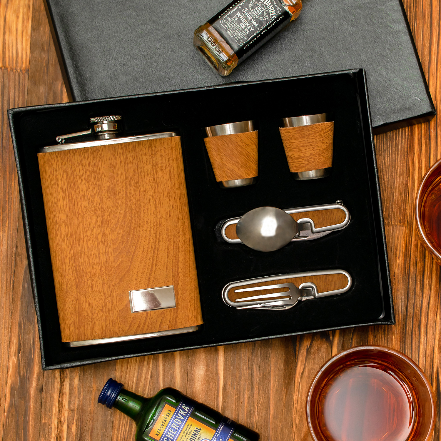 Фляга з чарками та столовими приладами – подарунковий набір, який стане в нагоді любителям активного дозвілля. Предмети виконані із нержавіючої сталі, мають шкіряне оздоблення. Ложка і виделка складні. Елементи поміщені в футляр для зручного зберігання та перенесення.